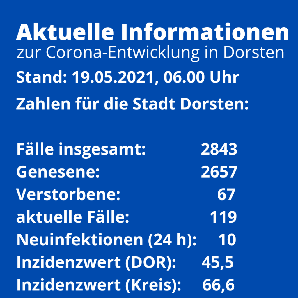 Aktuell gibt es in Dorsten 119 (- 5) infizierte Personen. 2843 (+ 10) waren bzw. sind aktuell infiziert. 2657 (+ 14) sind inzwischen wieder genesen. 67 (+ 1) Personen sind leider mit einer Covid19-Infektion (Corona) verstorben. Das bedeutet: 10 (+