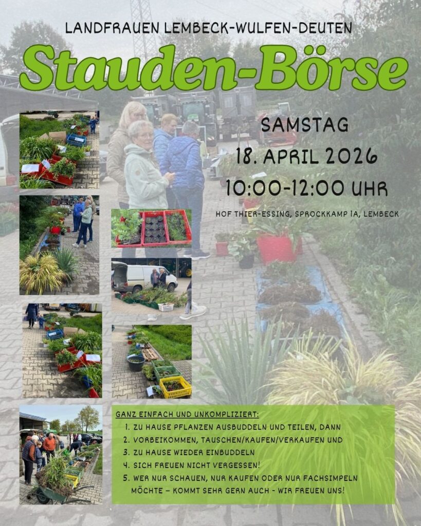 Wer noch ein freies Plätzchen im Garten hat, oder Stauden zum Verjüngen teilen und weitergeben möchte, ist herzlich eingeladen sich bei der Staudenbörse der Landfrauen Lembeck-Wulfen-Deuten am 18.04.2024 von 10.00 – 12.00 Uhr auf dem Hof Thier-Essing, Sprockkamp 1a, in Lembeck umzusehen.