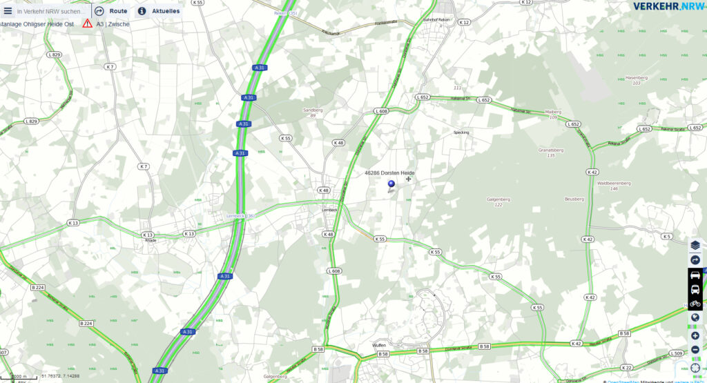 Die interaktive Karte zeigt, wie stark die Straßen in Lembeck und Umgebung aktuell belastet sind. Wenn Sie weiter reinzoomen, können Sie auch kleinere Straßen sehen. Außerdem können Sie hier Radwege und den öffentlichen Nahverkehr abfragen.