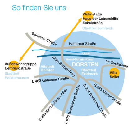 Die Wohnstätte Haus der Lebenshilfebefindet sich im Stadtteil Dorsten-Lembeck in der Schulstraße 25 und liegt 5 Autominuten von der Autobahnausfahrt der A31 entfernt. Der ruhig gelegene Ortsteil Lembeck ist umgeben von Feldern und Wäldern und bietet so die Möglichkeit für Spaziergänge und Fahrradtouren in der näheren Umgebung.