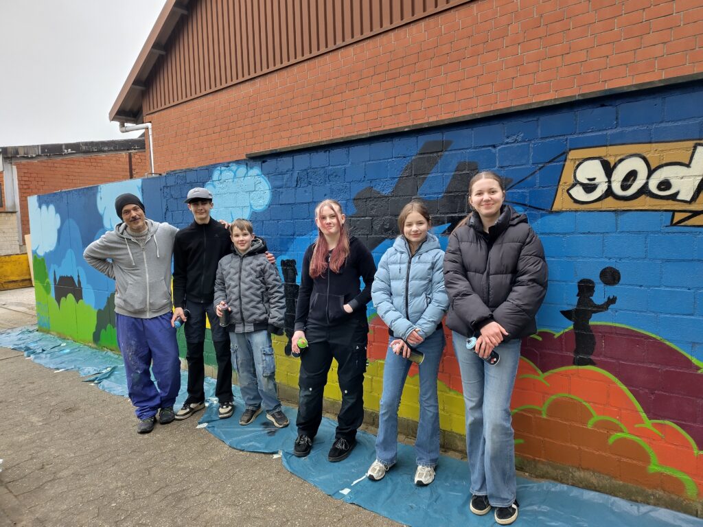 Nach neun Jahren erstrahlt die Graffiti-Wand am Spielplatz des Seniorenzentrums in neuem Glanz. In den vergangenen Osterferien haben Jugendliche des T.O.T. Lembeck (Kinder- und Jugendtreff) das in die Jahre gekommene Kunstwerk erneuert. Im Vorfeld wurde geschliffen und grundiert. Beim Sprayen wurden die jungen Künster vom Graffiti-Profi Marc Schiemann unterstützt.