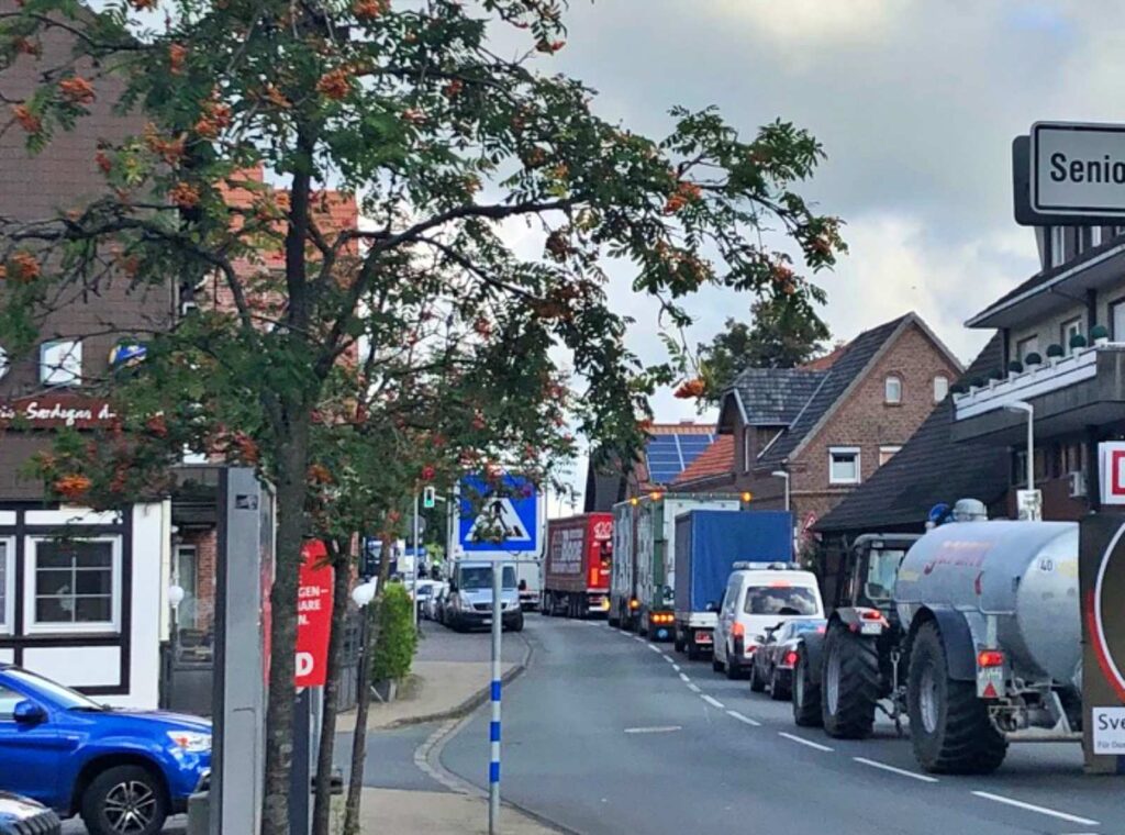 Die Kreuzung war während der Unfallaufnahme gesperrt. Der entstandene Stau zog sich weit ins Dorf hinein.