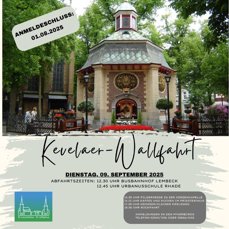 Am Dienstag, den 09. September 2025, lädt die Pfarrgemeinde herzlich zur traditionellen Wallfahrt nach Kevelaer ein – ein Tag der Besinnung, Begegnung und gemeinsamen Andacht.